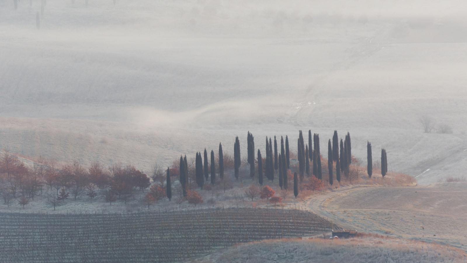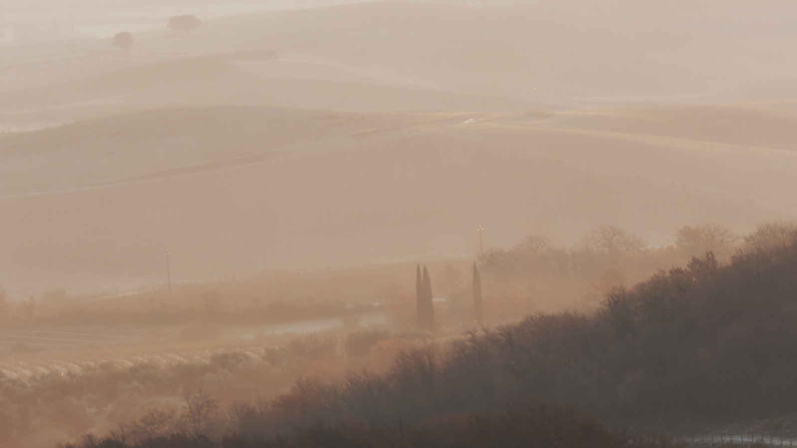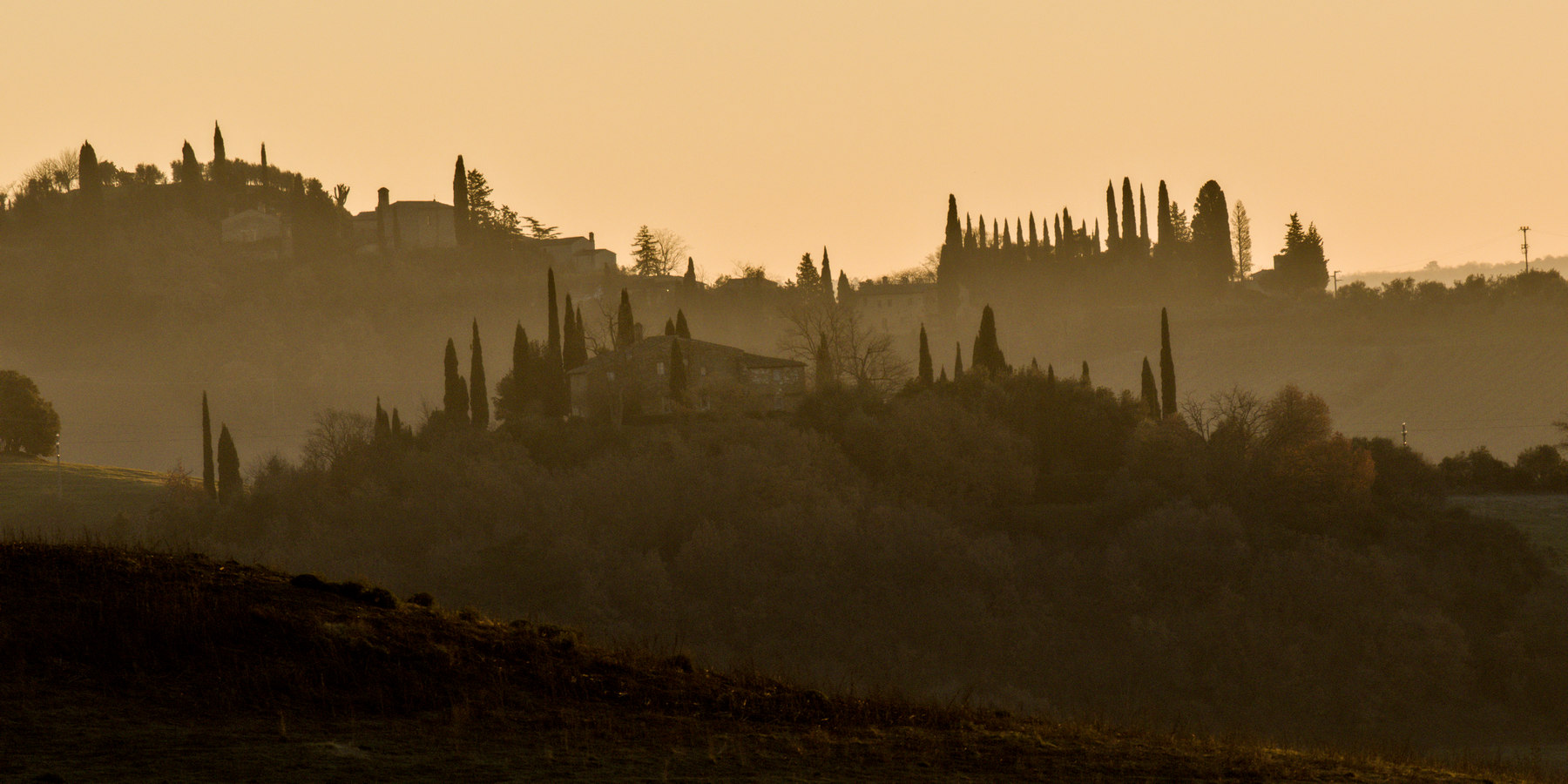 Pour cette balade dans le Val d’Orcia, notre itinéraire a emprunté les incontournables routes SP14 et SP146. Mais la meilleure combinaison [site/heure/lumière/brumes] a été par hasard découverte sur le chemin entre Buonconvento et San Giovanni d’Asso au lieu-dit Pieve a Salti. Où une chasse aux sangliers matinale  nous a heureusement sorti des duvets pour profiter de la magie des brumes et lumières.