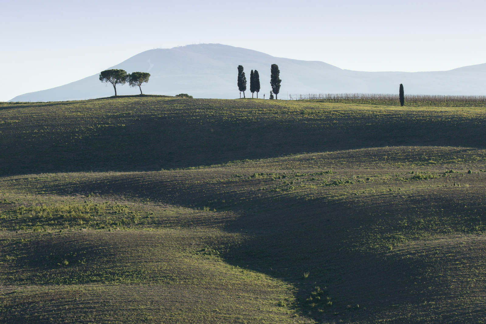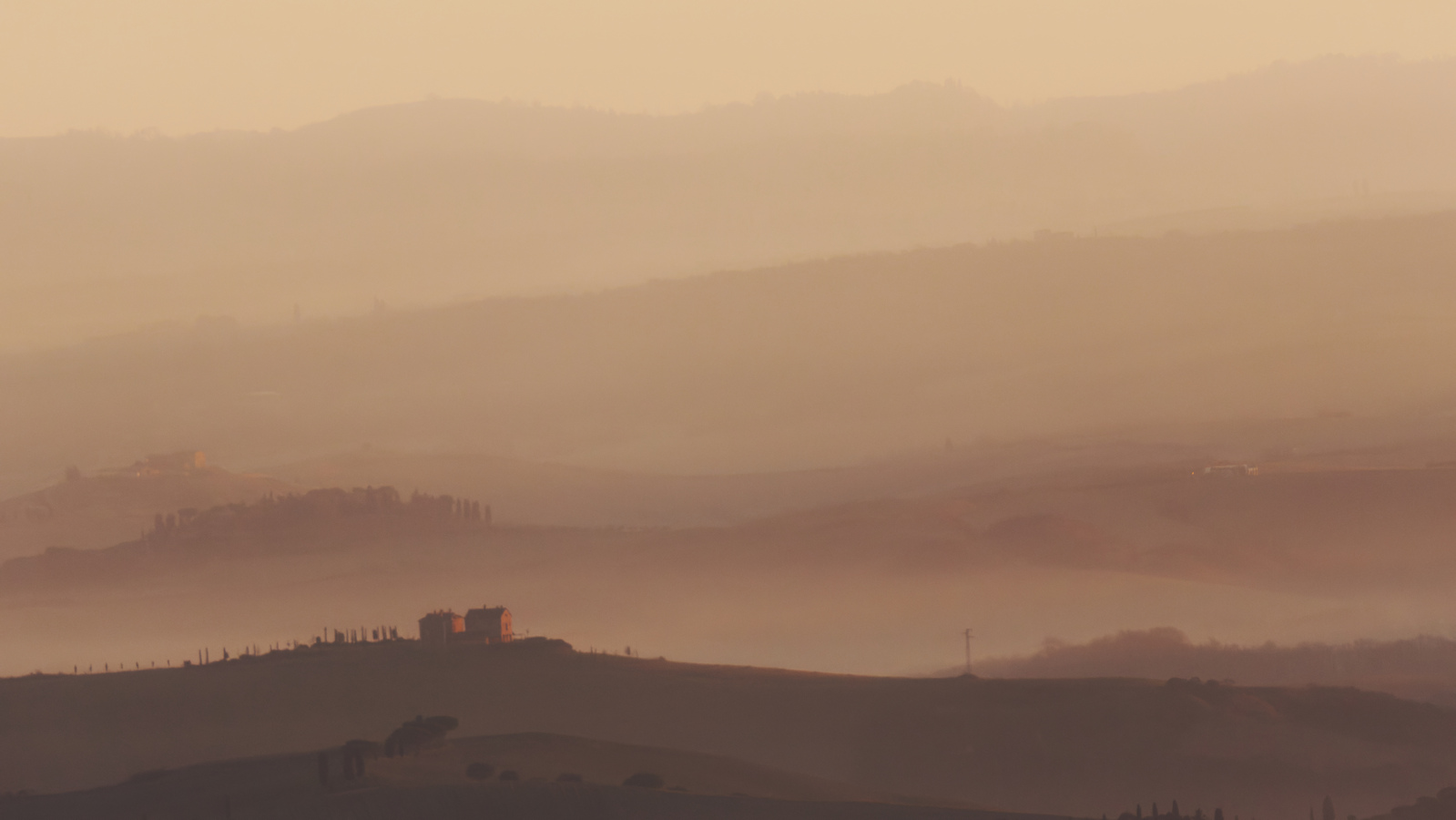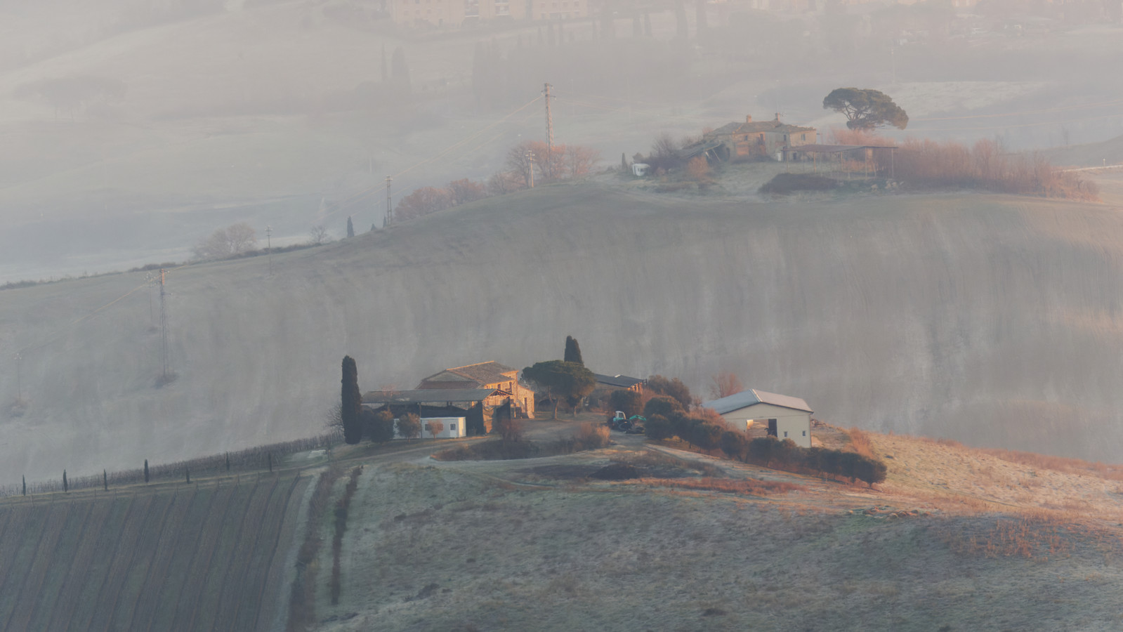 Pour cette balade dans le Val d’Orcia, notre itinéraire a emprunté les incontournables routes SP14 et SP146. Mais la meilleure combinaison [site/heure/lumière/brumes] a été par hasard découverte sur le chemin entre Buonconvento et San Giovanni d’Asso au lieu-dit Pieve a Salti. Où une chasse aux sangliers matinale  nous a heureusement sorti des duvets pour profiter de la magie des brumes et lumières.