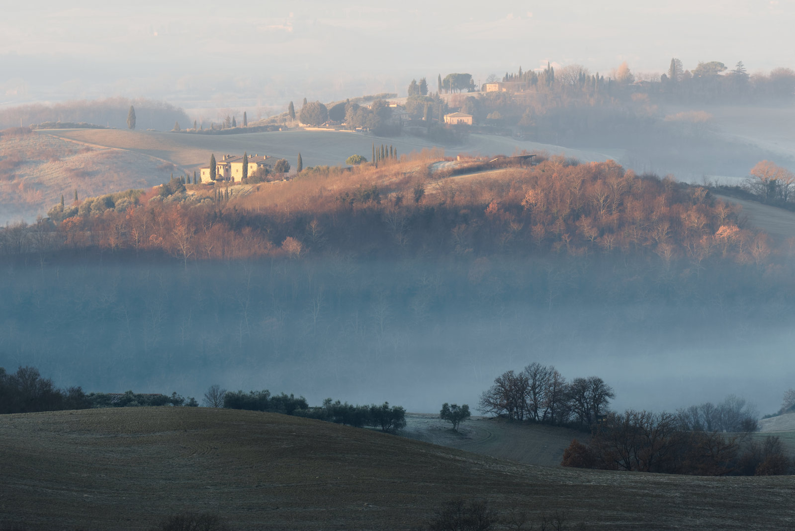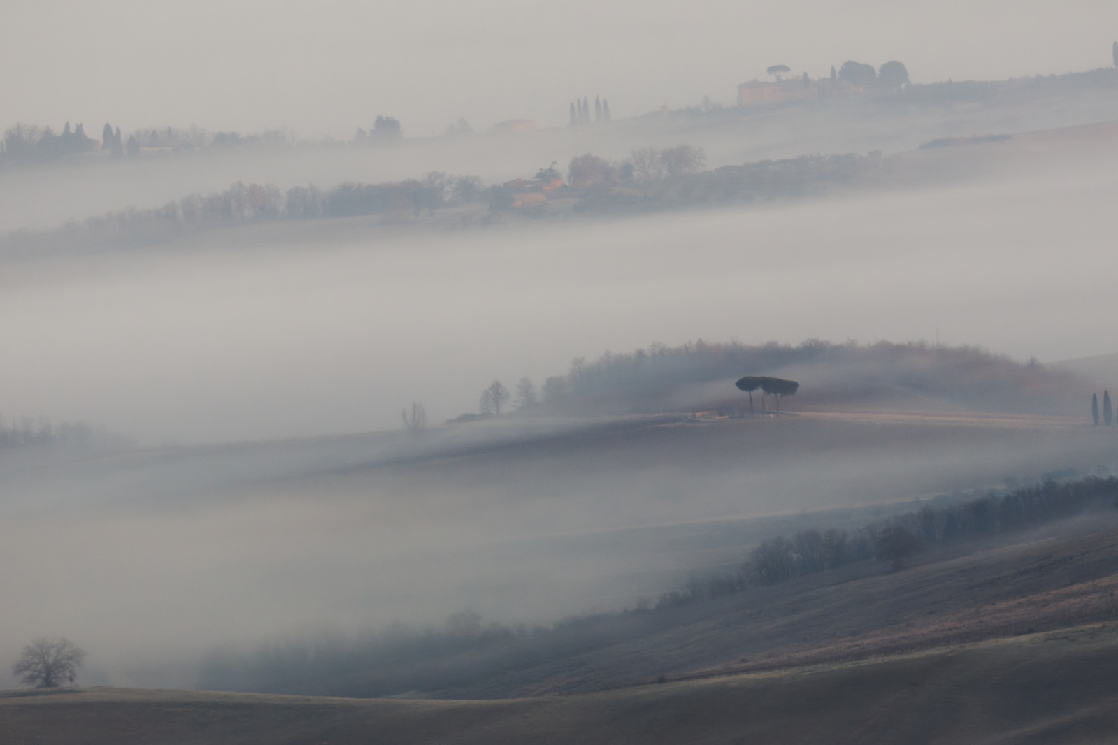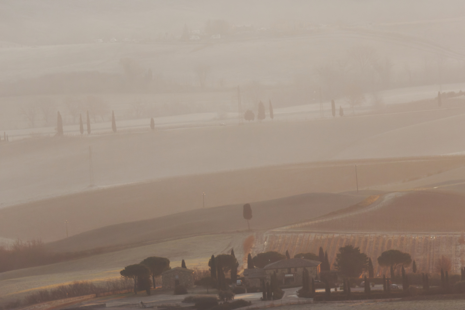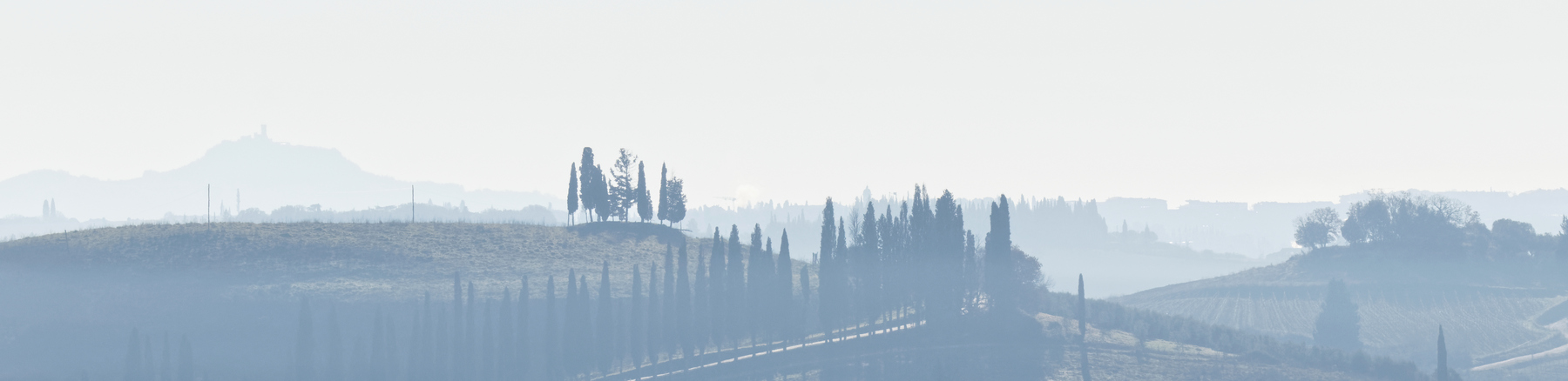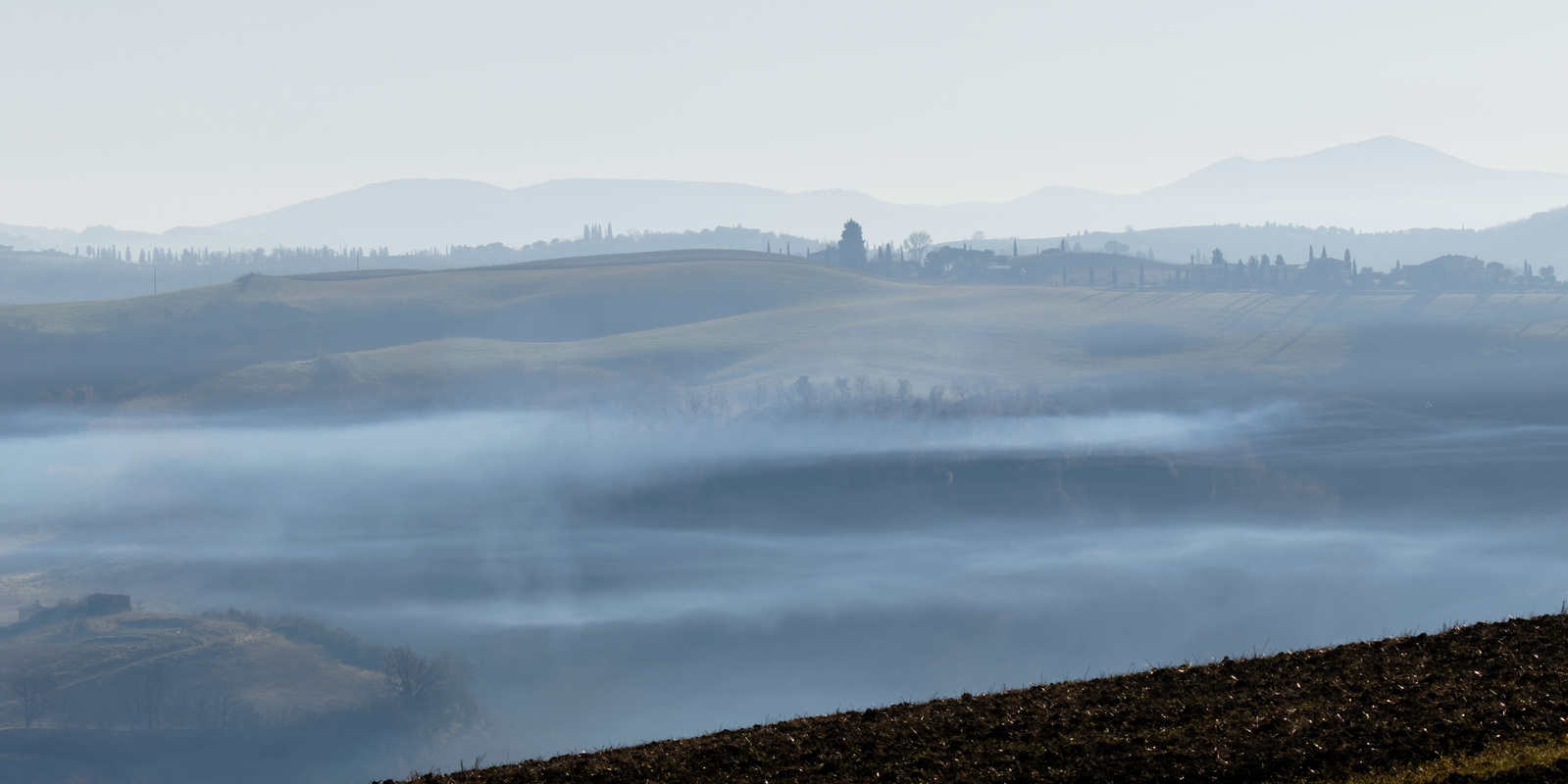 Le Val d’Orcia est situé dans la province de Sienne en Toscane.  Joyau parmi les joyaux, il fait figure de terre bénie des dieux. Il apparaît sur toutes les destinations touristiques et offre à chaque visiteur, même le moins curieux, des lieux de découverte d’une rare beauté.  Ses collines douces bordées ou couronnées de rangées de cyprès florentins sont surtout célèbres pour ses peintures et ses photos de champs fleuris aux couleurs extraordinaires. On pourrait dès lors être tenté de fuir les saisons a priori moins favorables, dont l’hiver. Ce serait une erreur car le Val d’Orcia offre, même en saison froide, des paysages qui enchanteront les visiteurs. Les photos qui suivent ont été réalisées dans les derniers jours de l’année 2004 au moment où les collines étaient nimbées de brumes matinales, ajoutant un voile de douceur de plus en plus épais au fur et à mesure que les regards se perdent dans le lointain. Et la magie fût complète quand au matin du 31 décembre 2024 nous avons ouvert les volets de la fenêtre de l’hôtel Rei di Capitani à Montalcino. Le regard s’ouvre sur l’immense vallée de la rivière d’Orcia, baignée dans la brume matinale. De timides rayons d’un soleil levant inondent les plans successifs qu’un artiste divin a déposé là et offert à la contemplation des humains.