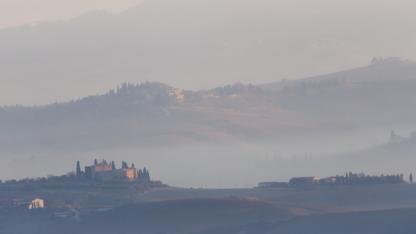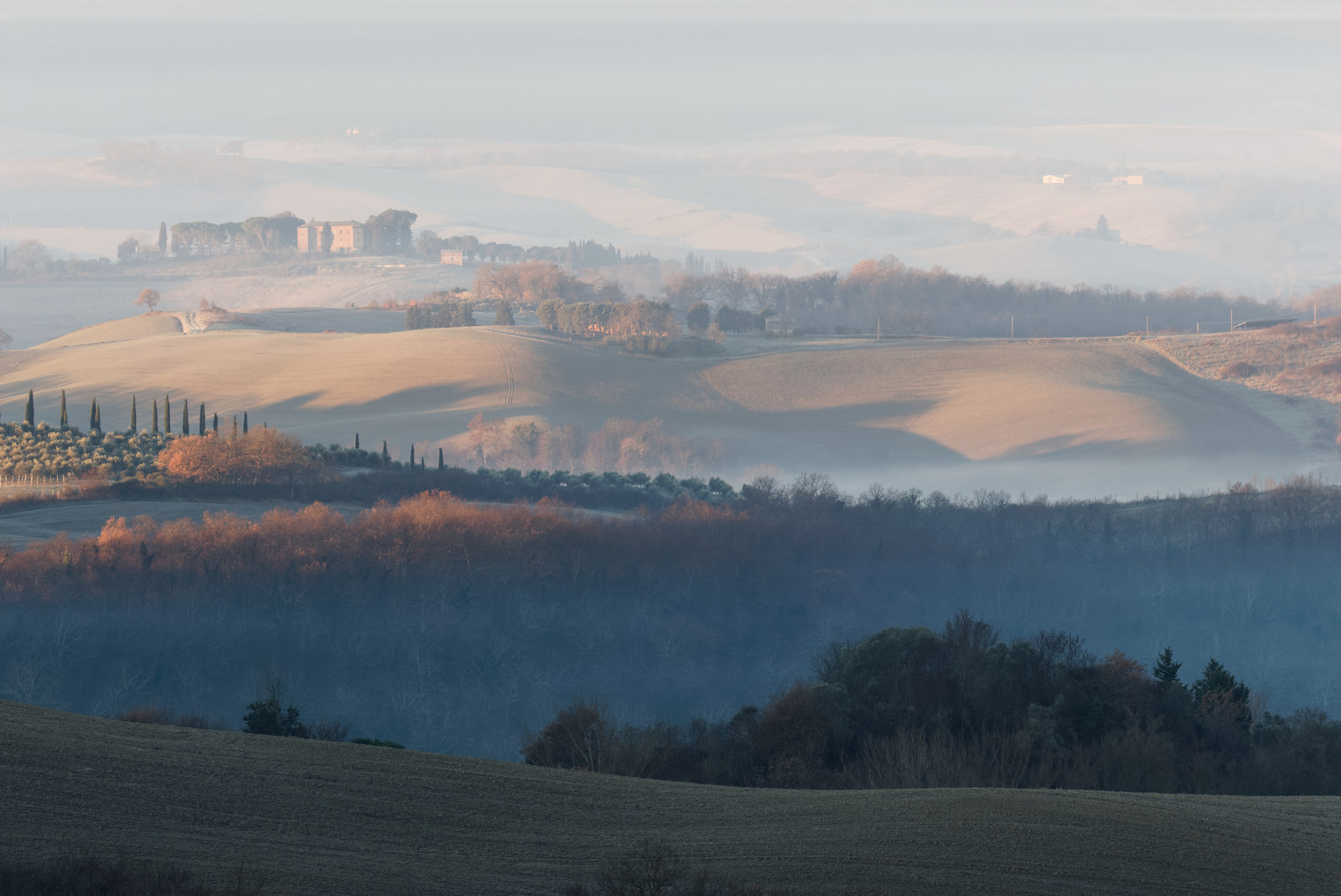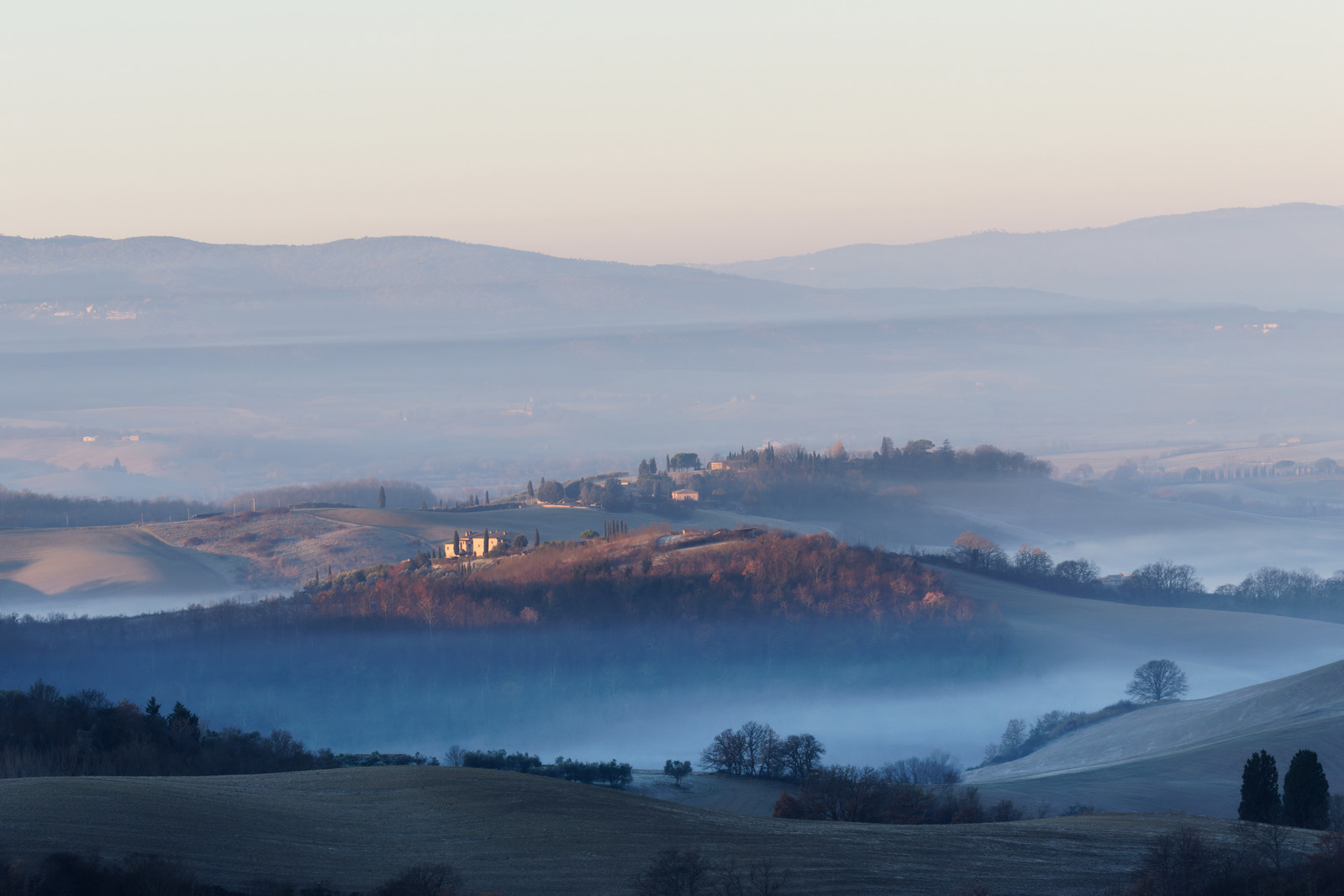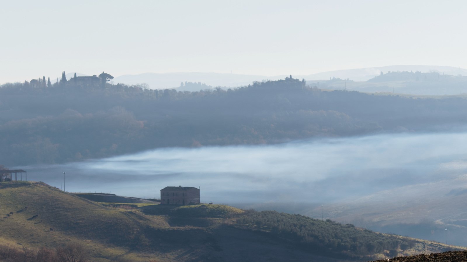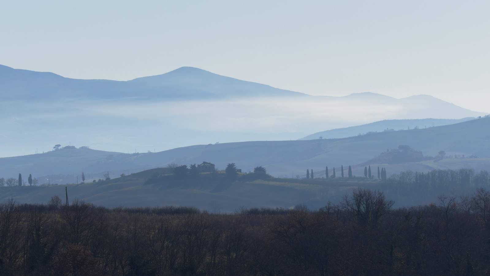 Le Val d’Orcia est situé dans la province de Sienne en Toscane.  Joyau parmi les joyaux, il fait figure de terre bénie des dieux. Il apparaît sur toutes les destinations touristiques et offre à chaque visiteur, même le moins curieux, des lieux de découverte d’une rare beauté.  Ses collines douces bordées ou couronnées de rangées de cyprès florentins sont surtout célèbres pour ses peintures et ses photos de champs fleuris aux couleurs extraordinaires. On pourrait dès lors être tenté de fuir les saisons a priori moins favorables, dont l’hiver. Ce serait une erreur car le Val d’Orcia offre, même en saison froide, des paysages qui enchanteront les visiteurs. Les photos qui suivent ont été réalisées dans les derniers jours de l’année 2004 au moment où les collines étaient nimbées de brumes matinales, ajoutant un voile de douceur de plus en plus épais au fur et à mesure que les regards se perdent dans le lointain. Et la magie fût complète quand au matin du 31 décembre 2024 nous avons ouvert les volets de la fenêtre de l’hôtel Rei di Capitani à Montalcino. Le regard s’ouvre sur l’immense vallée de la rivière d’Orcia, baignée dans la brume matinale. De timides rayons d’un soleil levant inondent les plans successifs qu’un artiste divin a déposé là et offert à la contemplation des humains.