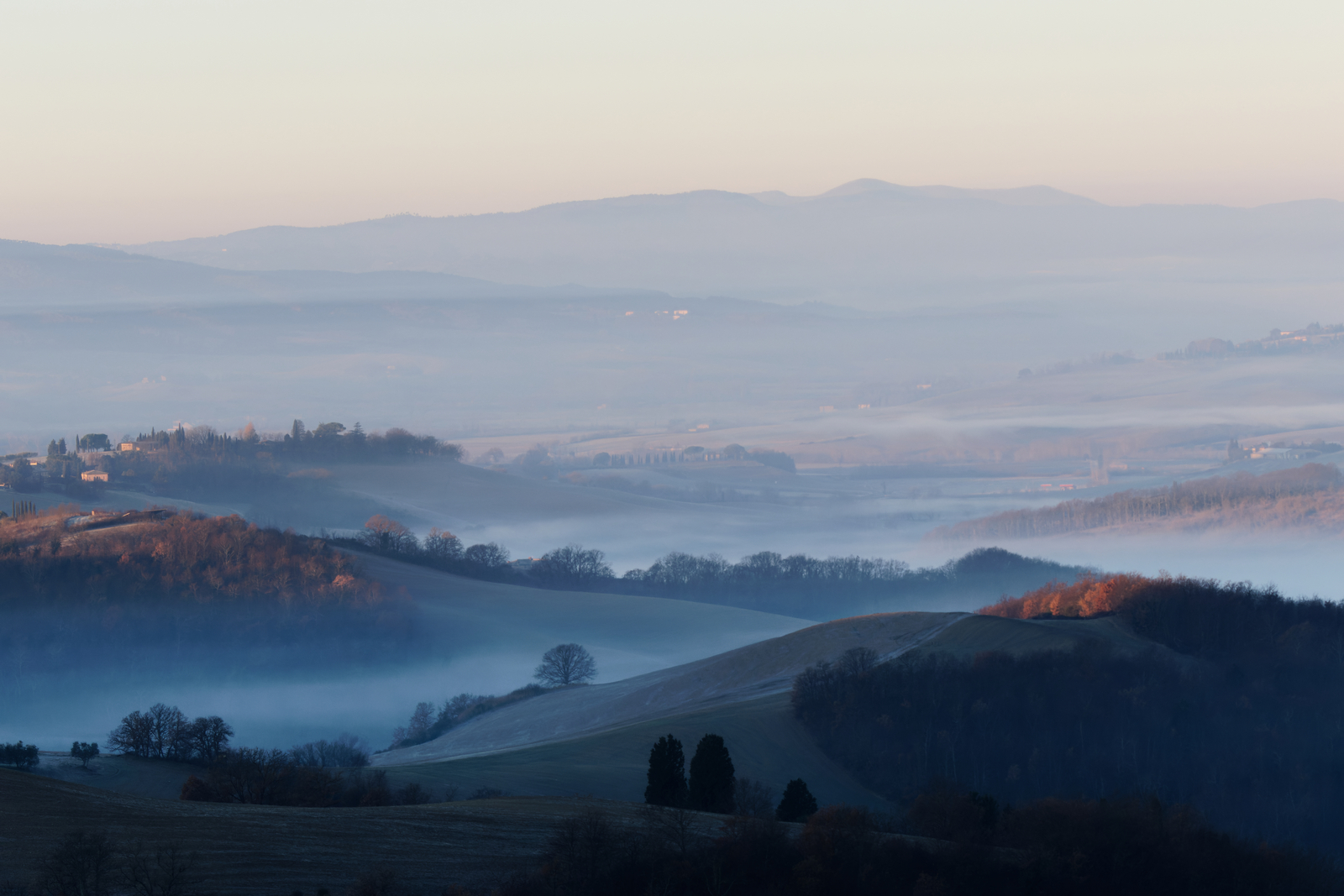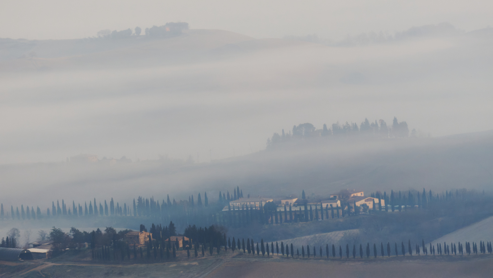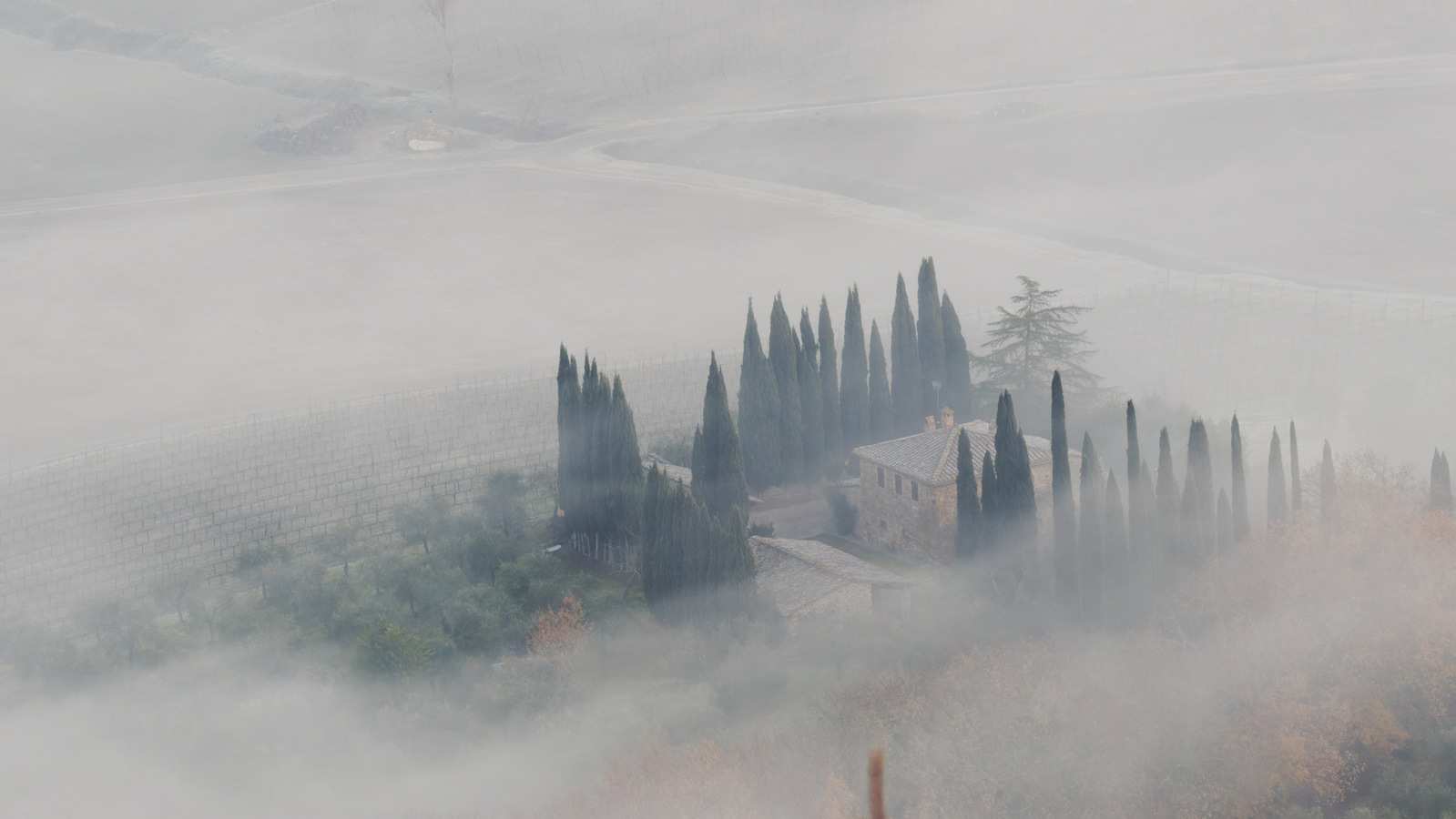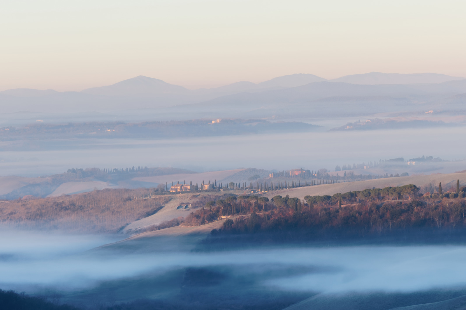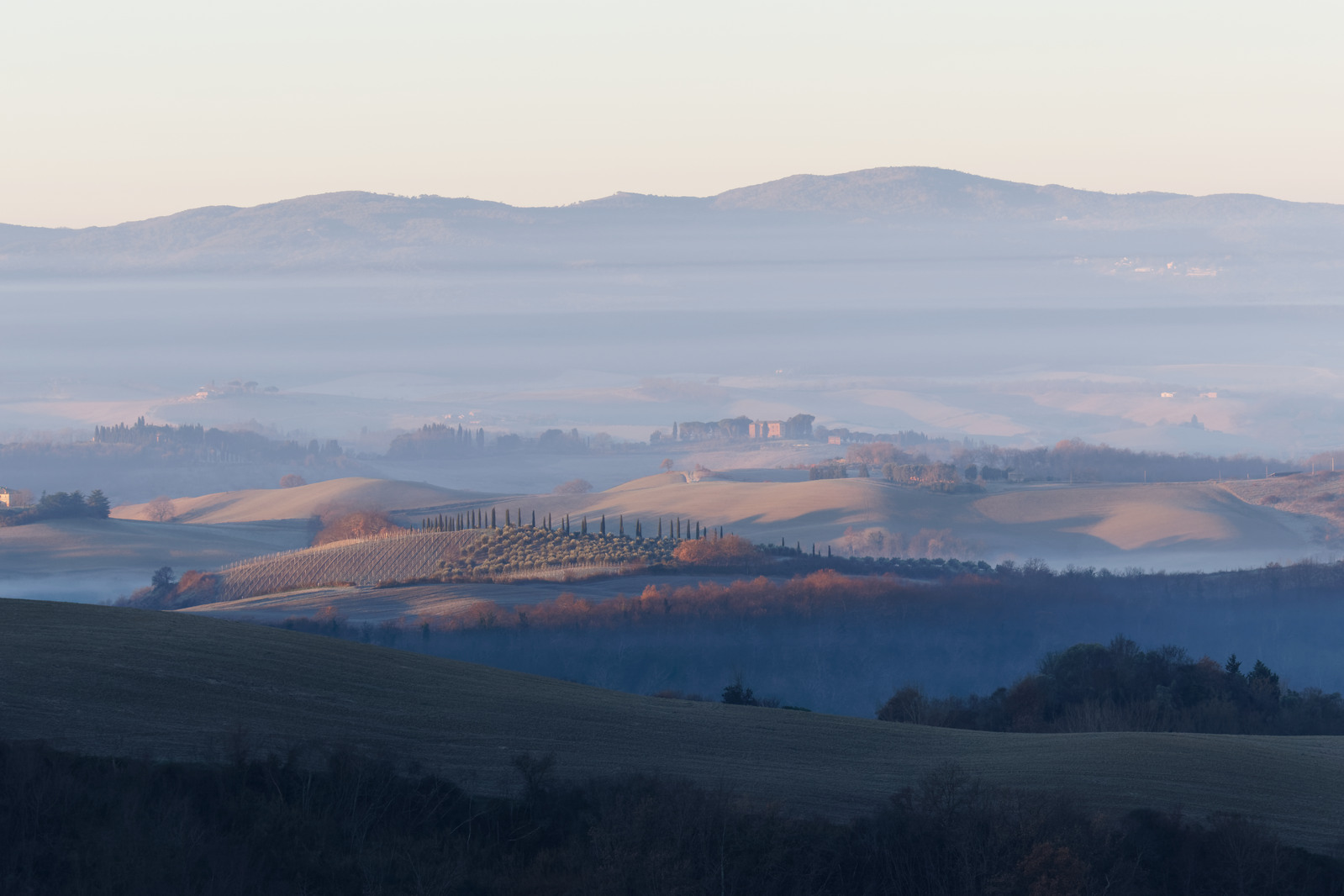 Le Val d’Orcia est situé dans la province de Sienne en Toscane.  Joyau parmi les joyaux, il fait figure de terre bénie des dieux. Il apparaît sur toutes les destinations touristiques et offre à chaque visiteur, même le moins curieux, des lieux de découverte d’une rare beauté.  Ses collines douces bordées ou couronnées de rangées de cyprès florentins sont surtout célèbres pour ses peintures et ses photos de champs fleuris aux couleurs extraordinaires. On pourrait dès lors être tenté de fuir les saisons a priori moins favorables, dont l’hiver. Ce serait une erreur car le Val d’Orcia offre, même en saison froide, des paysages qui enchanteront les visiteurs. Les photos qui suivent ont été réalisées dans les derniers jours de l’année 2004 au moment où les collines étaient nimbées de brumes matinales, ajoutant un voile de douceur de plus en plus épais au fur et à mesure que les regards se perdent dans le lointain. Et la magie fût complète quand au matin du 31 décembre 2024 nous avons ouvert les volets de la fenêtre de l’hôtel Rei di Capitani à Montalcino. Le regard s’ouvre sur l’immense vallée de la rivière d’Orcia, baignée dans la brume matinale. De timides rayons d’un soleil levant inondent les plans successifs qu’un artiste divin a déposé là et offert à la contemplation des humains.