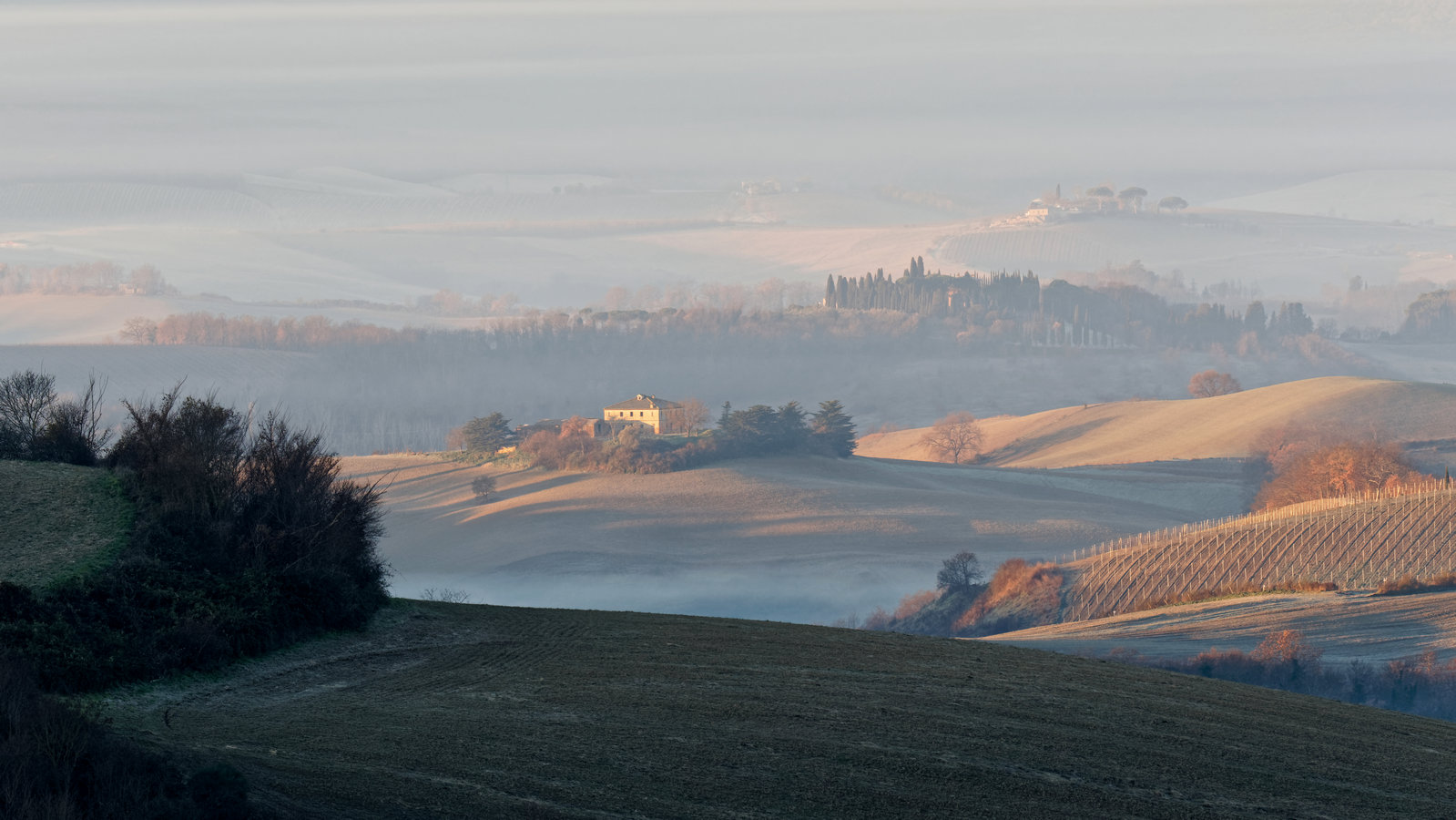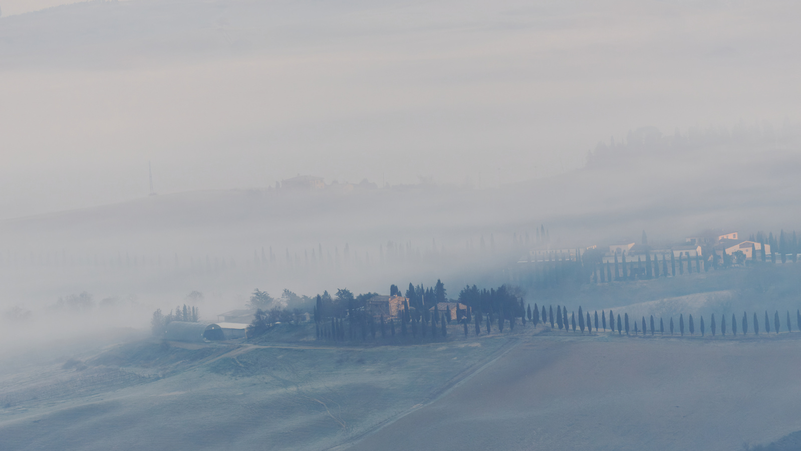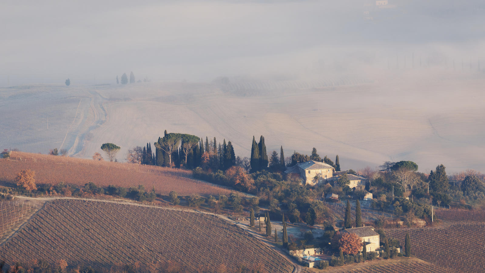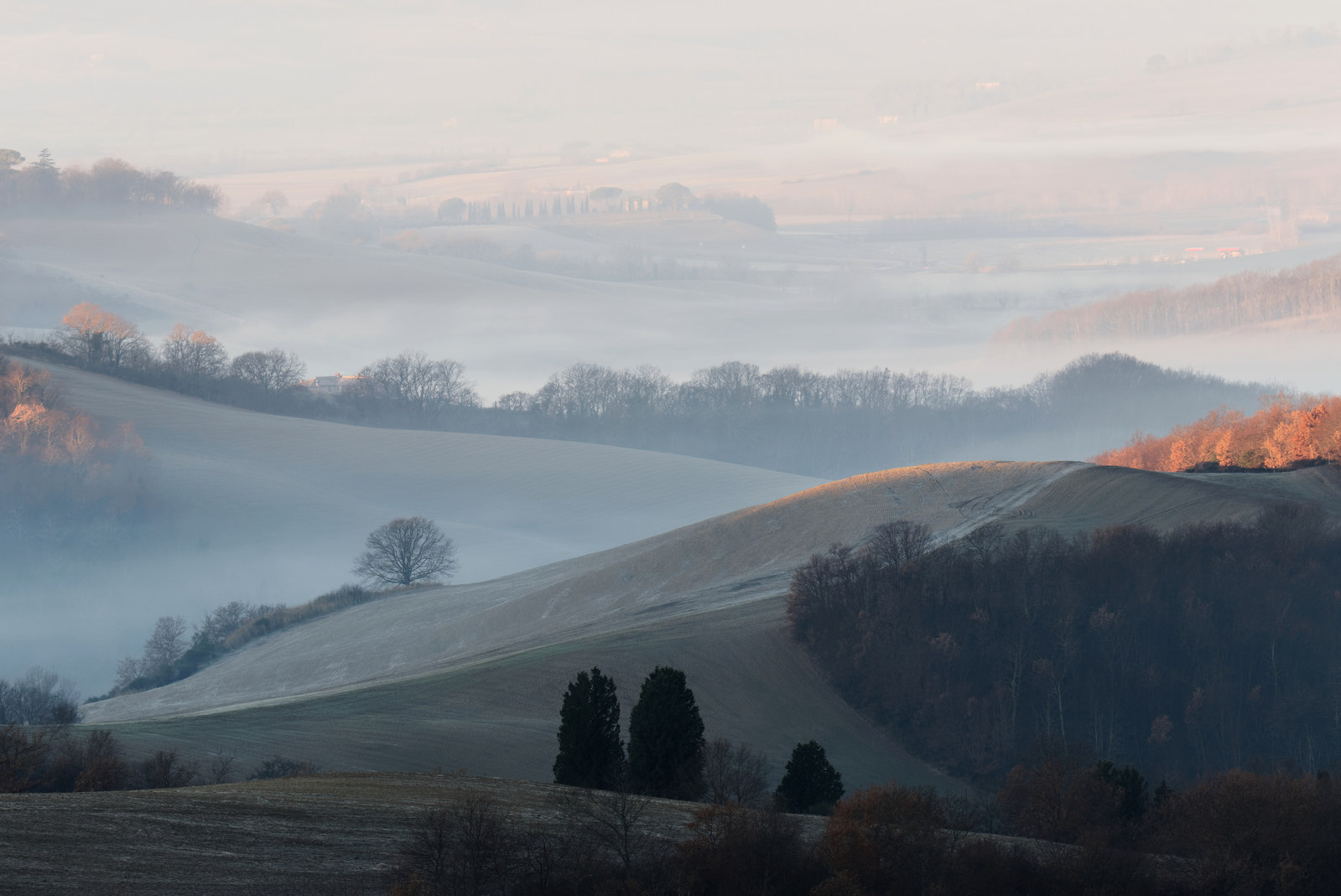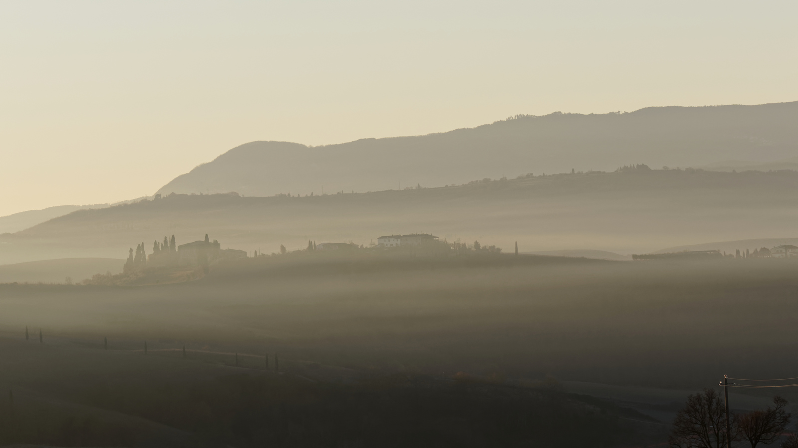 Le Val d’Orcia est situé dans la province de Sienne en Toscane.  Joyau parmi les joyaux, il fait figure de terre bénie des dieux. Il apparaît sur toutes les destinations touristiques et offre à chaque visiteur, même le moins curieux, des lieux de découverte d’une rare beauté.  Ses collines douces bordées ou couronnées de rangées de cyprès florentins sont surtout célèbres pour ses peintures et ses photos de champs fleuris aux couleurs extraordinaires. On pourrait dès lors être tenté de fuir les saisons a priori moins favorables, dont l’hiver. Ce serait une erreur car le Val d’Orcia offre, même en saison froide, des paysages qui enchanteront les visiteurs. Les photos qui suivent ont été réalisées dans les derniers jours de l’année 2004 au moment où les collines étaient nimbées de brumes matinales, ajoutant un voile de douceur de plus en plus épais au fur et à mesure que les regards se perdent dans le lointain. Et la magie fût complète quand au matin du 31 décembre 2024 nous avons ouvert les volets de la fenêtre de l’hôtel Rei di Capitani à Montalcino. Le regard s’ouvre sur l’immense vallée de la rivière d’Orcia, baignée dans la brume matinale. De timides rayons d’un soleil levant inondent les plans successifs qu’un artiste divin a déposé là et offert à la contemplation des humains.