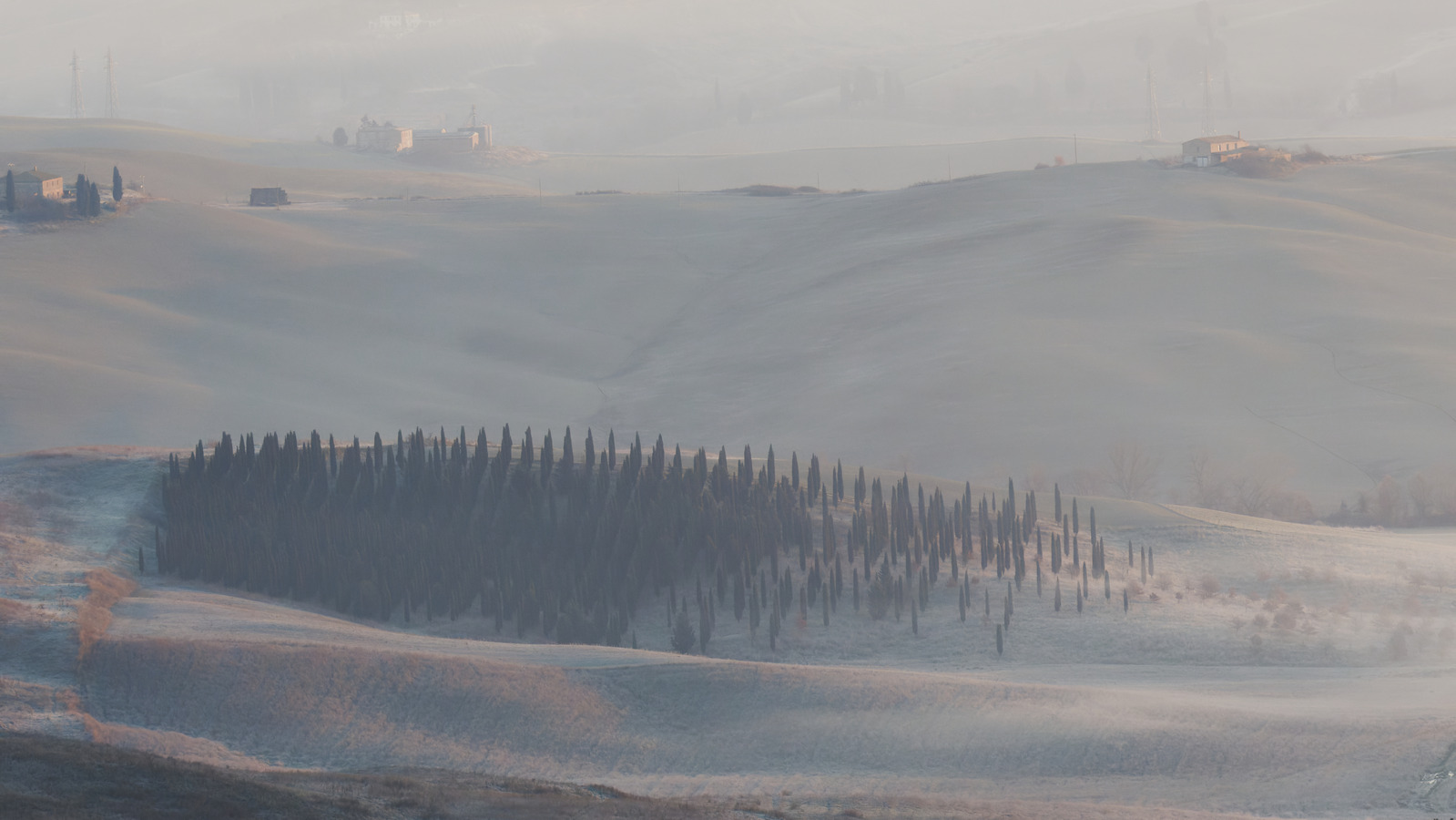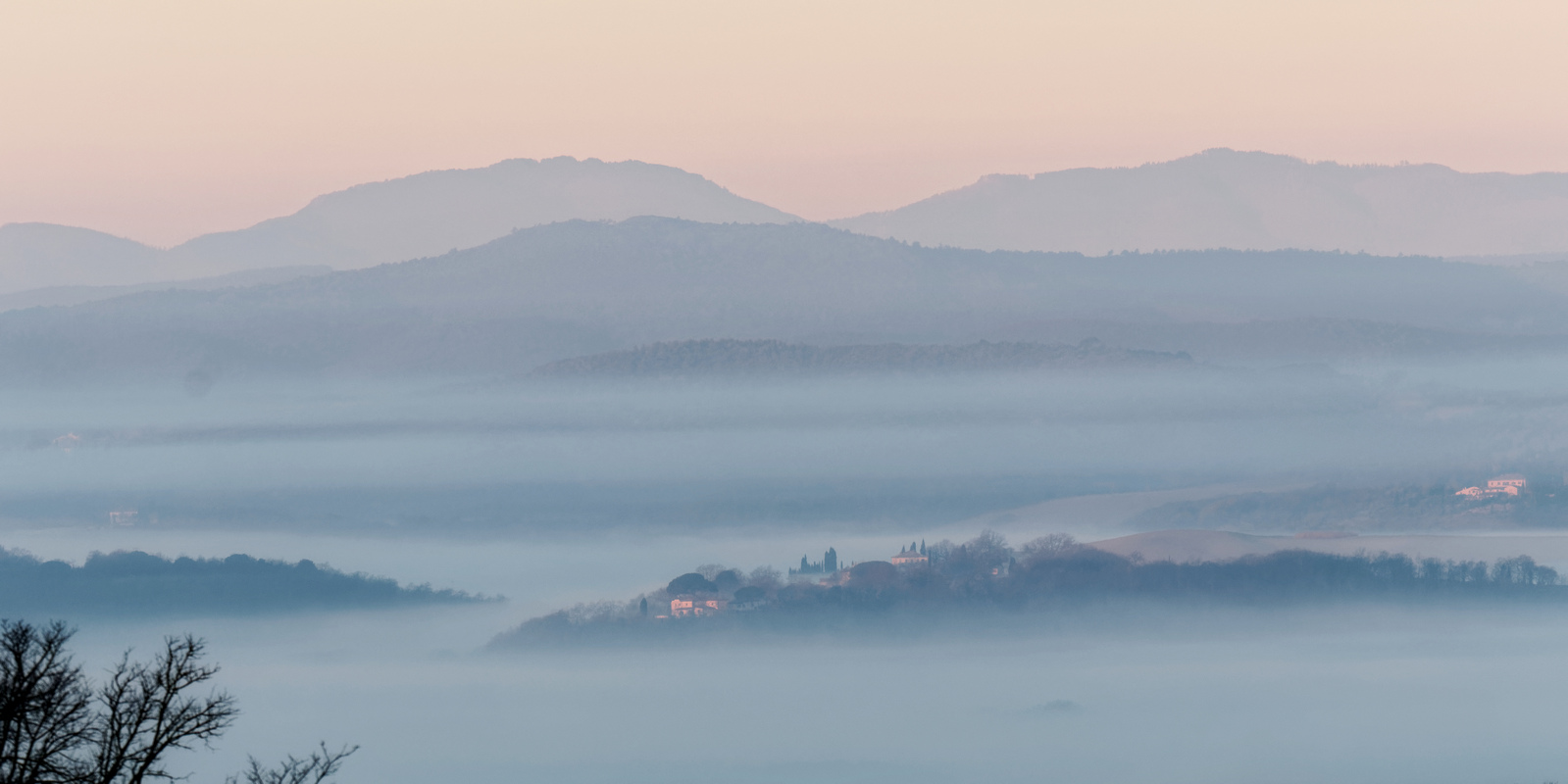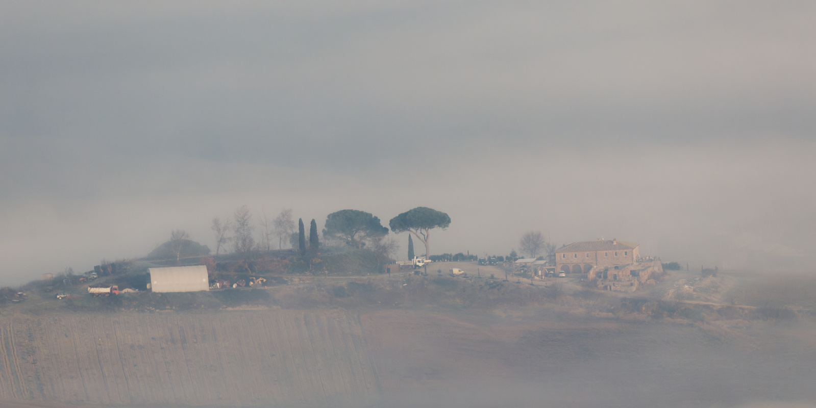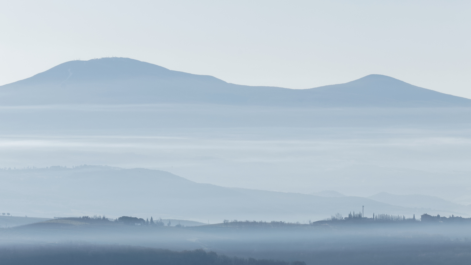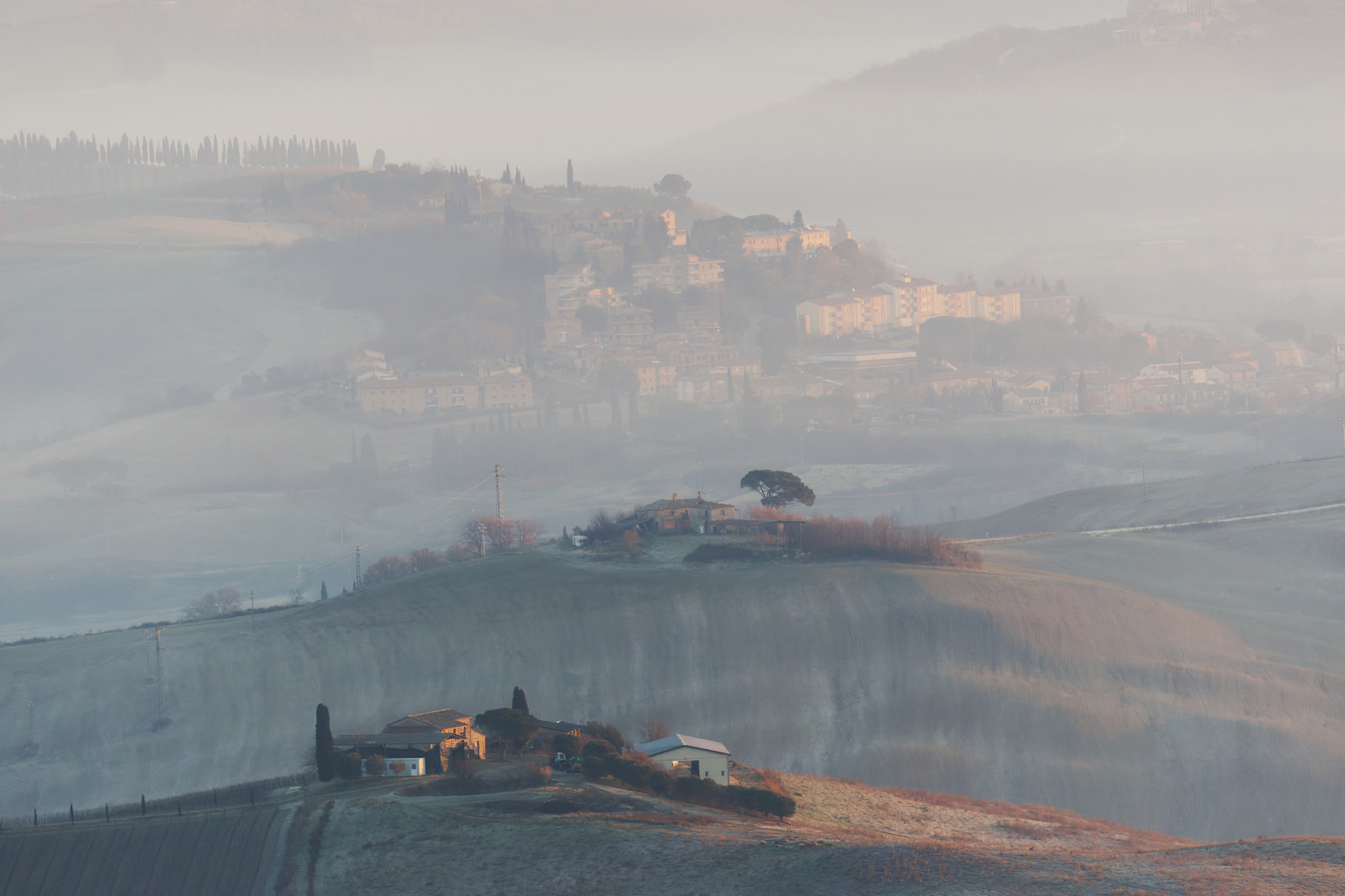 Le Val d’Orcia est situé dans la province de Sienne en Toscane.  Joyau parmi les joyaux, il fait figure de terre bénie des dieux. Il apparaît sur toutes les destinations touristiques et offre à chaque visiteur, même le moins curieux, des lieux de découverte d’une rare beauté.  Ses collines douces bordées ou couronnées de rangées de cyprès florentins sont surtout célèbres pour ses peintures et ses photos de champs fleuris aux couleurs extraordinaires. On pourrait dès lors être tenté de fuir les saisons a priori moins favorables, dont l’hiver. Ce serait une erreur car le Val d’Orcia offre, même en saison froide, des paysages qui enchanteront les visiteurs. Les photos qui suivent ont été réalisées dans les derniers jours de l’année 2004 au moment où les collines étaient nimbées de brumes matinales, ajoutant un voile de douceur de plus en plus épais au fur et à mesure que les regards se perdent dans le lointain. Et la magie fût complète quand au matin du 31 décembre 2024 nous avons ouvert les volets de la fenêtre de l’hôtel Rei di Capitani à Montalcino. Le regard s’ouvre sur l’immense vallée de la rivière d’Orcia, baignée dans la brume matinale. De timides rayons d’un soleil levant inondent les plans successifs qu’un artiste divin a déposé là et offert à la contemplation des humains.