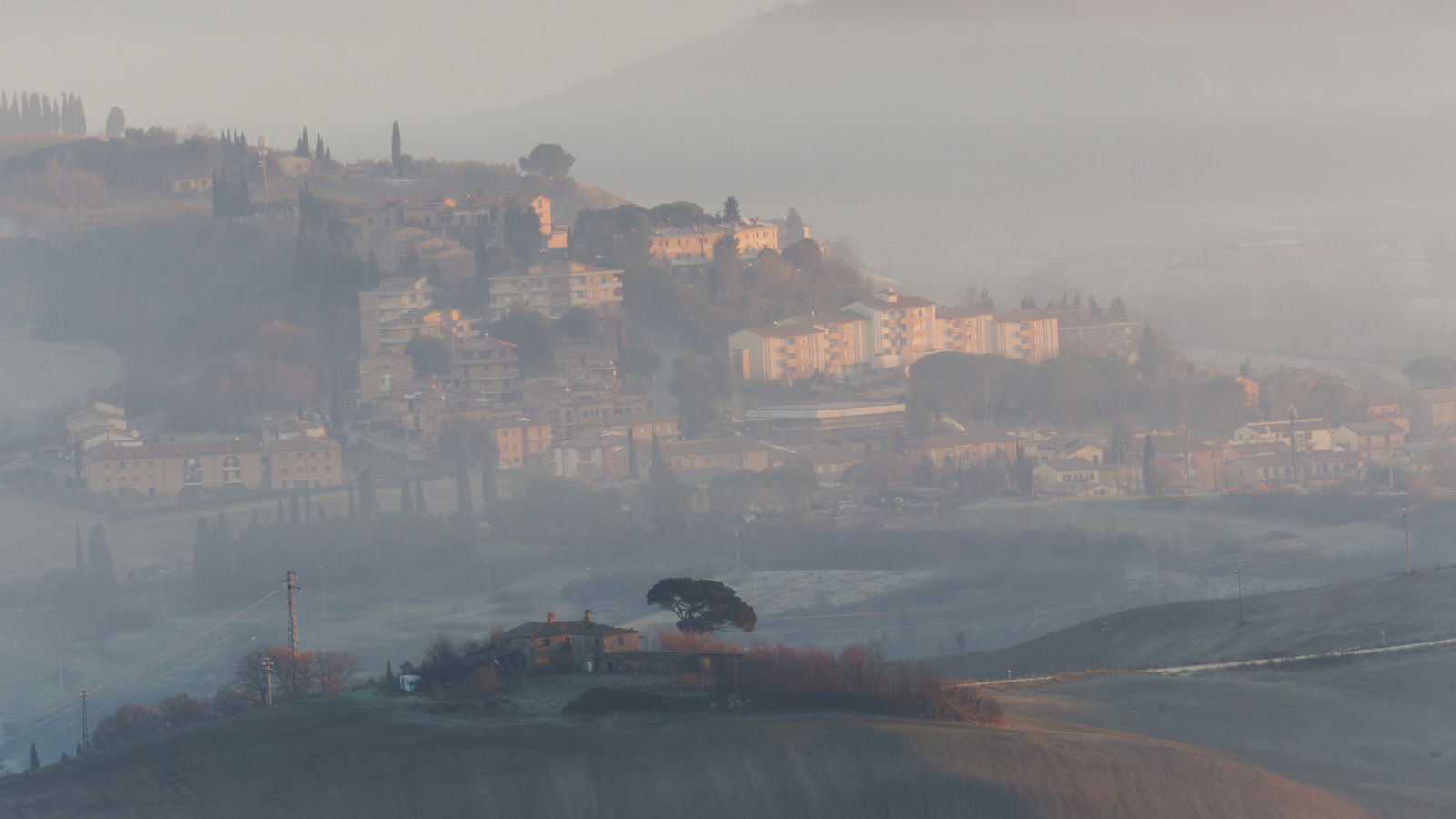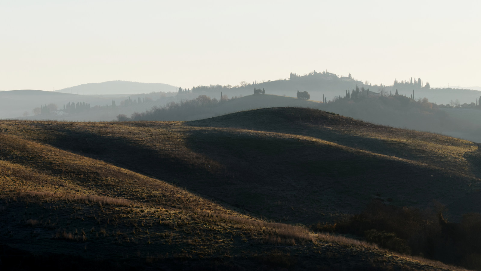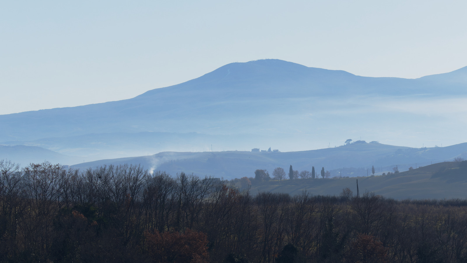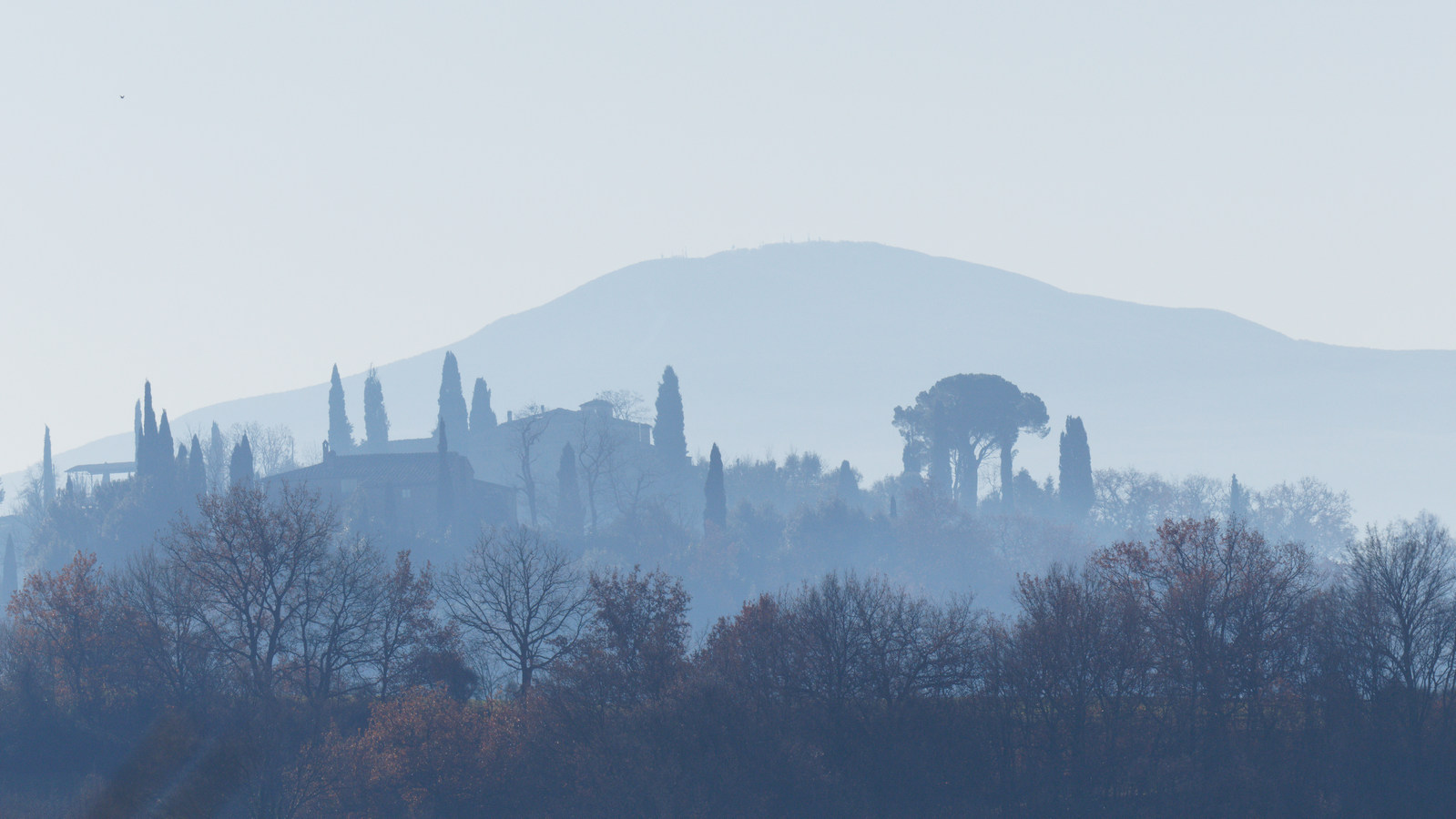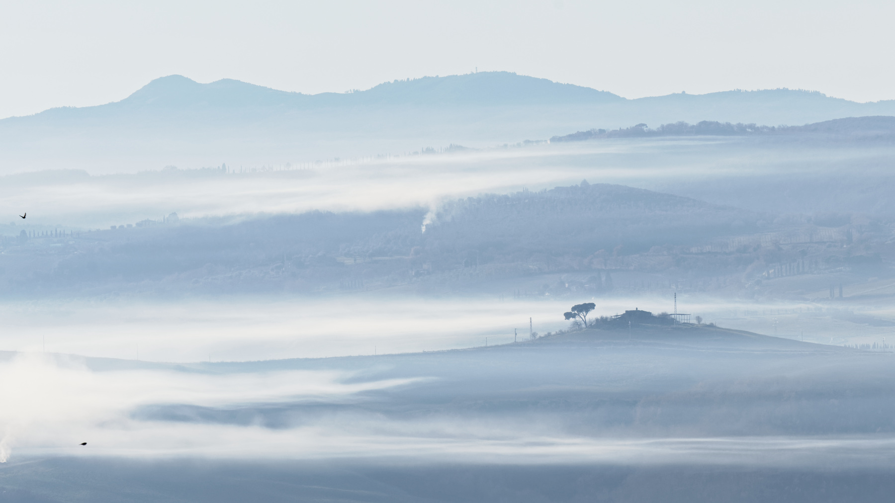 Le Val d’Orcia est situé dans la province de Sienne en Toscane.  Joyau parmi les joyaux, il fait figure de terre bénie des dieux. Il apparaît sur toutes les destinations touristiques et offre à chaque visiteur, même le moins curieux, des lieux de découverte d’une rare beauté.  Ses collines douces bordées ou couronnées de rangées de cyprès florentins sont surtout célèbres pour ses peintures et ses photos de champs fleuris aux couleurs extraordinaires. On pourrait dès lors être tenté de fuir les saisons a priori moins favorables, dont l’hiver. Ce serait une erreur car le Val d’Orcia offre, même en saison froide, des paysages qui enchanteront les visiteurs. Les photos qui suivent ont été réalisées dans les derniers jours de l’année 2004 au moment où les collines étaient nimbées de brumes matinales, ajoutant un voile de douceur de plus en plus épais au fur et à mesure que les regards se perdent dans le lointain. Et la magie fût complète quand au matin du 31 décembre 2024 nous avons ouvert les volets de la fenêtre de l’hôtel Rei di Capitani à Montalcino. Le regard s’ouvre sur l’immense vallée de la rivière d’Orcia, baignée dans la brume matinale. De timides rayons d’un soleil levant inondent les plans successifs qu’un artiste divin a déposé là et offert à la contemplation des humains.