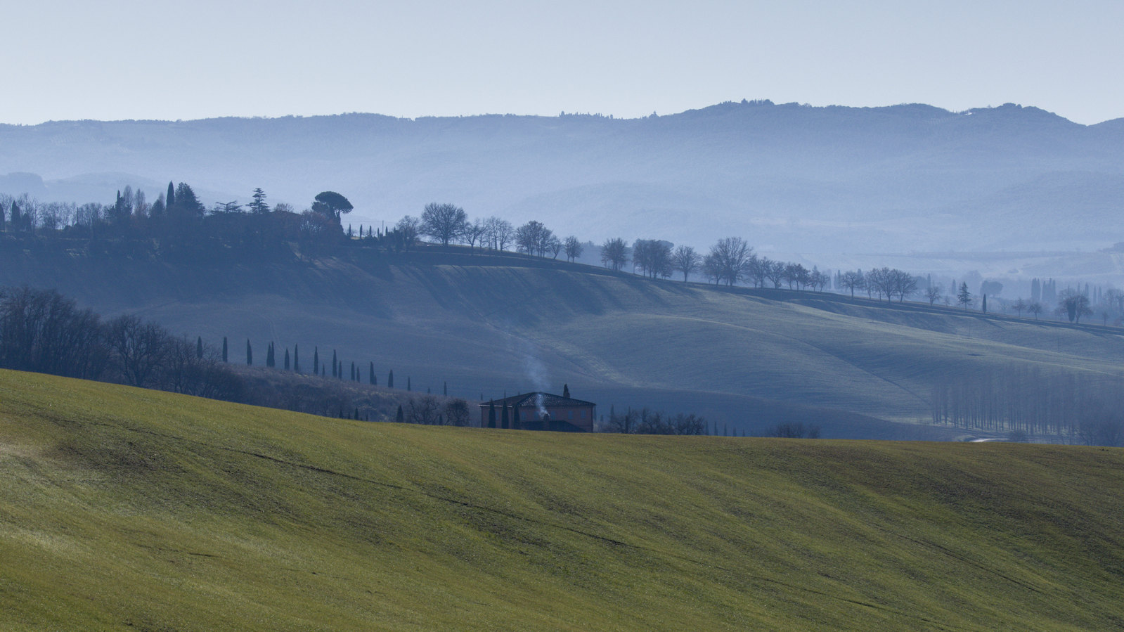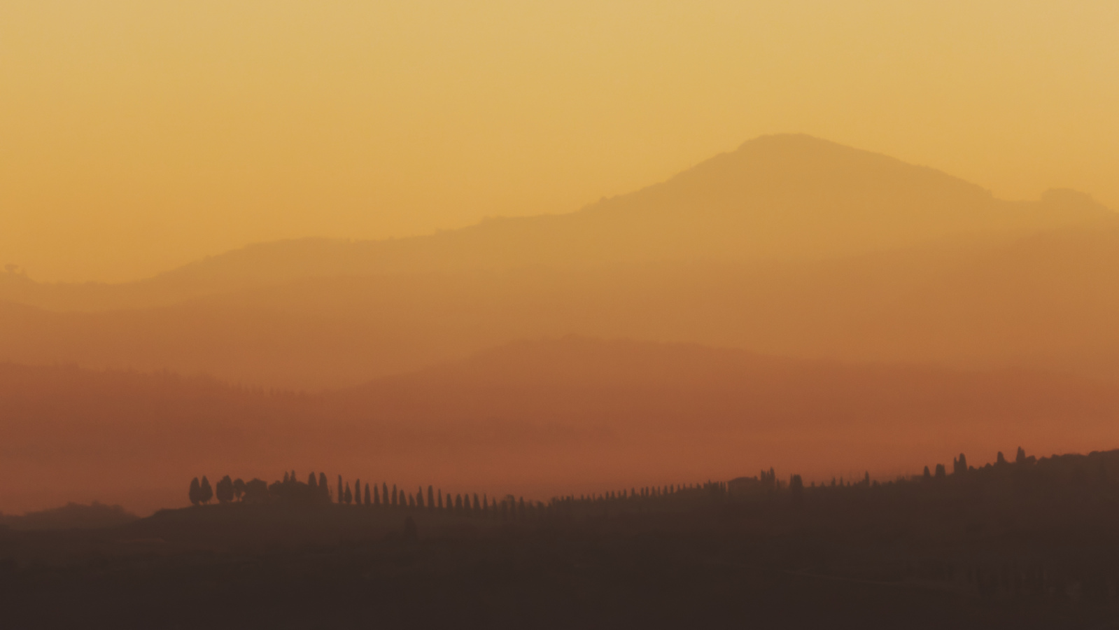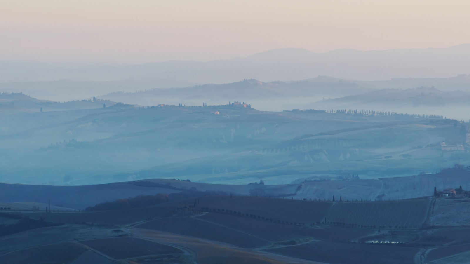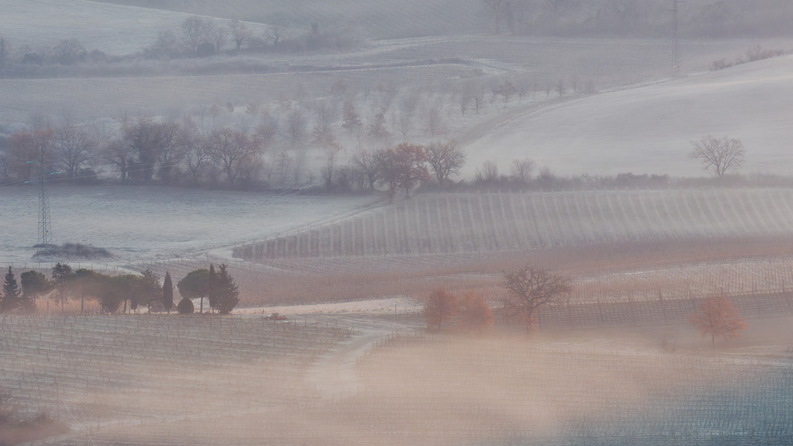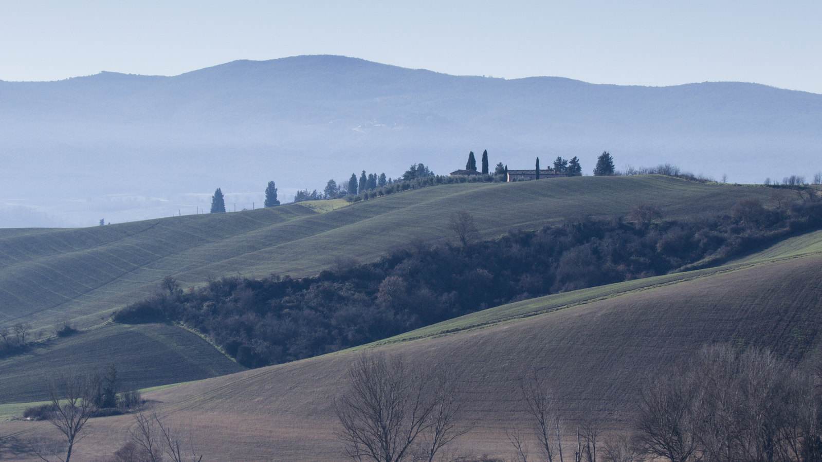 Le Val d’Orcia est situé dans la province de Sienne en Toscane.  Joyau parmi les joyaux, il fait figure de terre bénie des dieux. Il apparaît sur toutes les destinations touristiques et offre à chaque visiteur, même le moins curieux, des lieux de découverte d’une rare beauté.  Ses collines douces bordées ou couronnées de rangées de cyprès florentins sont surtout célèbres pour ses peintures et ses photos de champs fleuris aux couleurs extraordinaires. On pourrait dès lors être tenté de fuir les saisons a priori moins favorables, dont l’hiver. Ce serait une erreur car le Val d’Orcia offre, même en saison froide, des paysages qui enchanteront les visiteurs. Les photos qui suivent ont été réalisées dans les derniers jours de l’année 2004 au moment où les collines étaient nimbées de brumes matinales, ajoutant un voile de douceur de plus en plus épais au fur et à mesure que les regards se perdent dans le lointain. Et la magie fût complète quand au matin du 31 décembre 2024 nous avons ouvert les volets de la fenêtre de l’hôtel Rei di Capitani à Montalcino. Le regard s’ouvre sur l’immense vallée de la rivière d’Orcia, baignée dans la brume matinale. De timides rayons d’un soleil levant inondent les plans successifs qu’un artiste divin a déposé là et offert à la contemplation des humains.