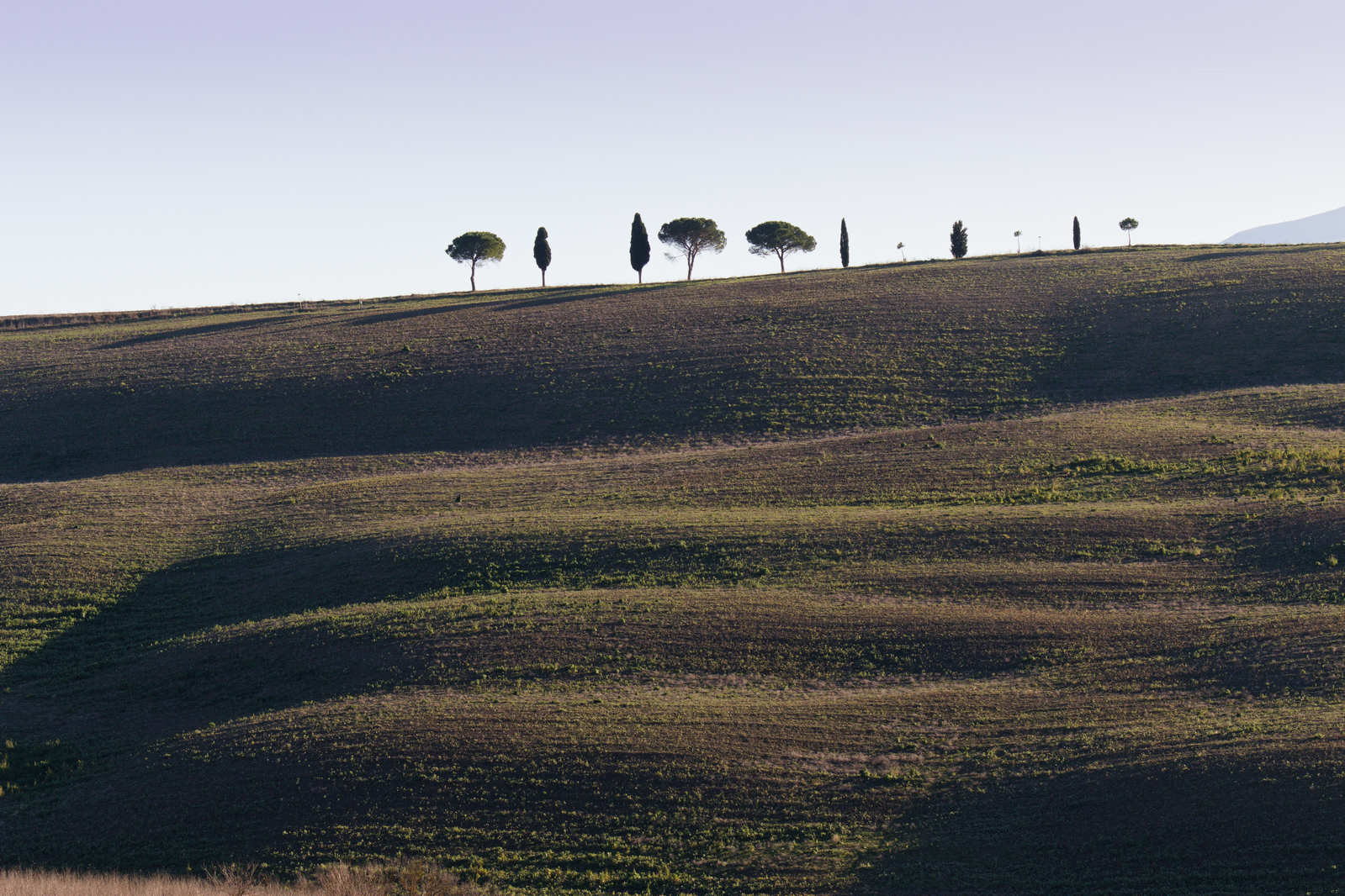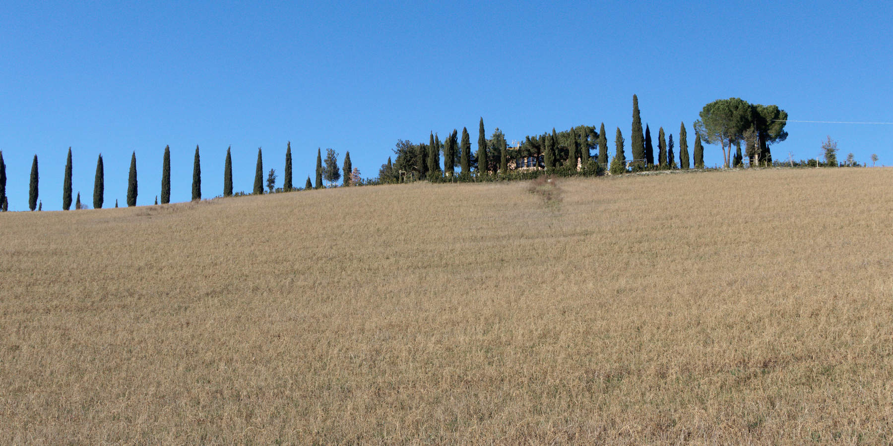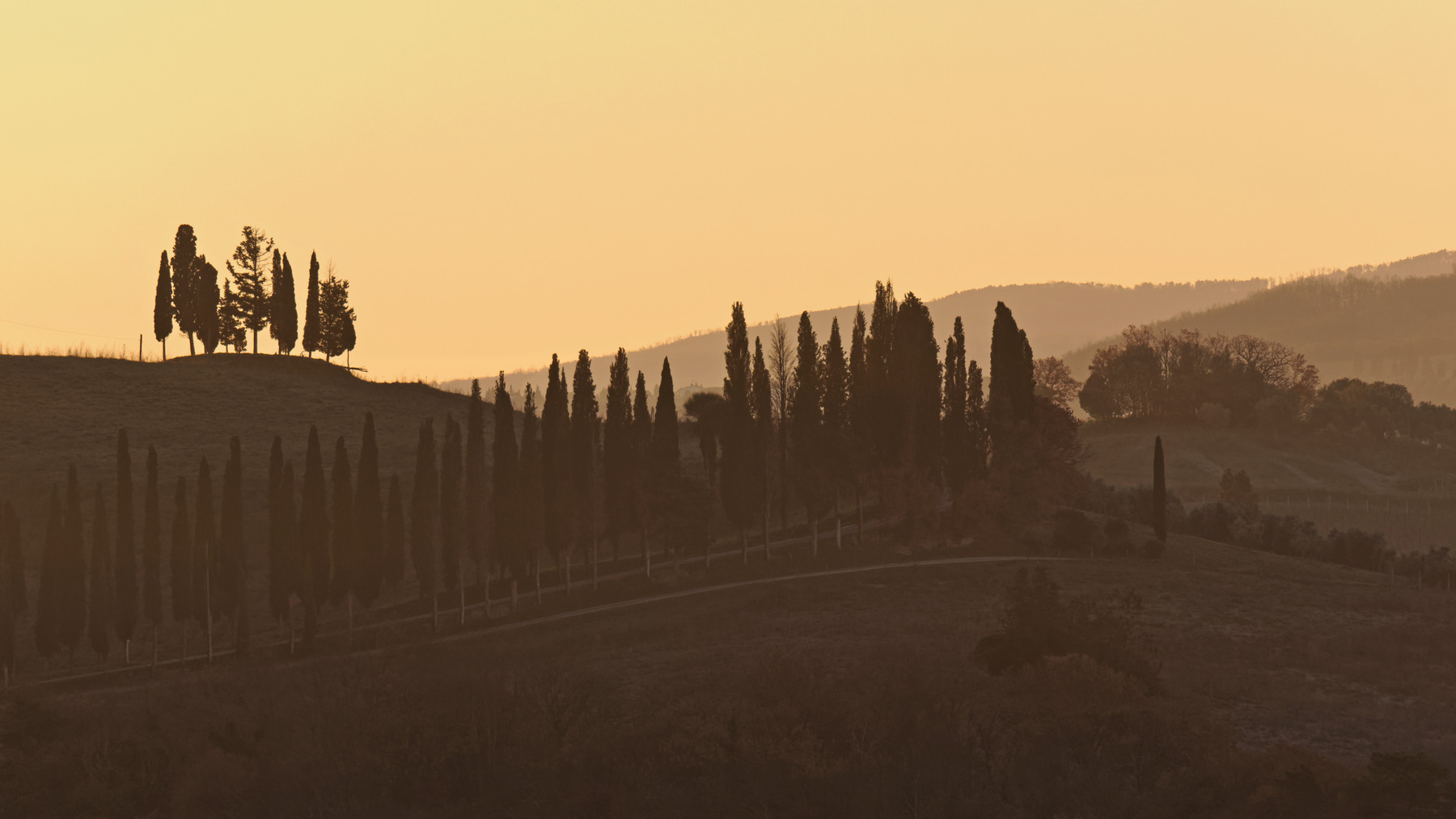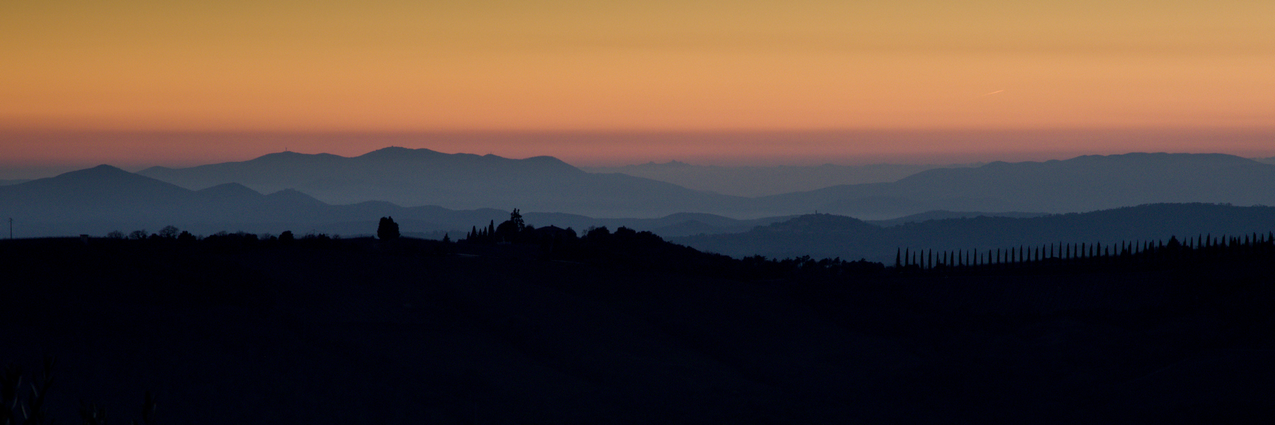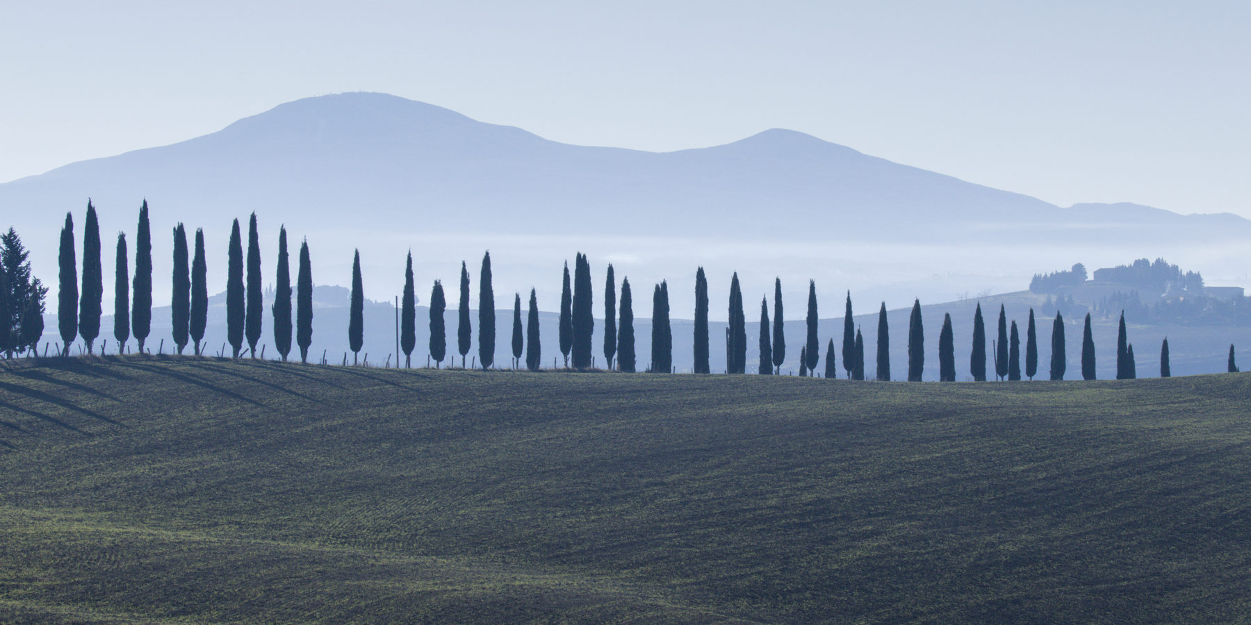Ce fut effectivement le cas les 29 et 30 décembre 2024 où notre balade sur les routes et les pistes du Val d’Orcia a été un enchantement. Des brumes matinales filtrant le soleil levant jusqu’au coucher du soleil, le spectacle était époustouflant. Tout au plus faut-il noter une petite faiblesse aux heures du début d’après-midi, pendant lesquelles les lumières dures découpaient les cyprès sur l’horizon. Donnant ainsi à voir les alignements du Val d’Orcia comme dans les guides touristiques!